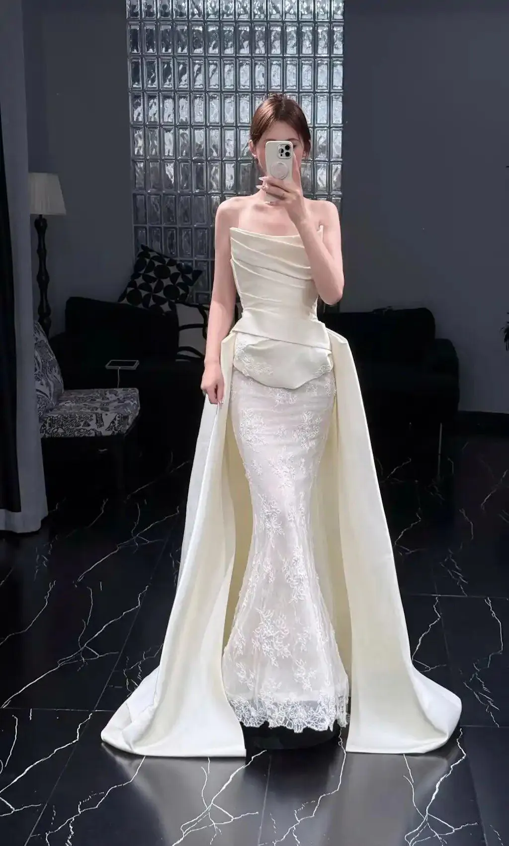 Strapless mermaid wedding dress with draped bodice and delicate lace trim