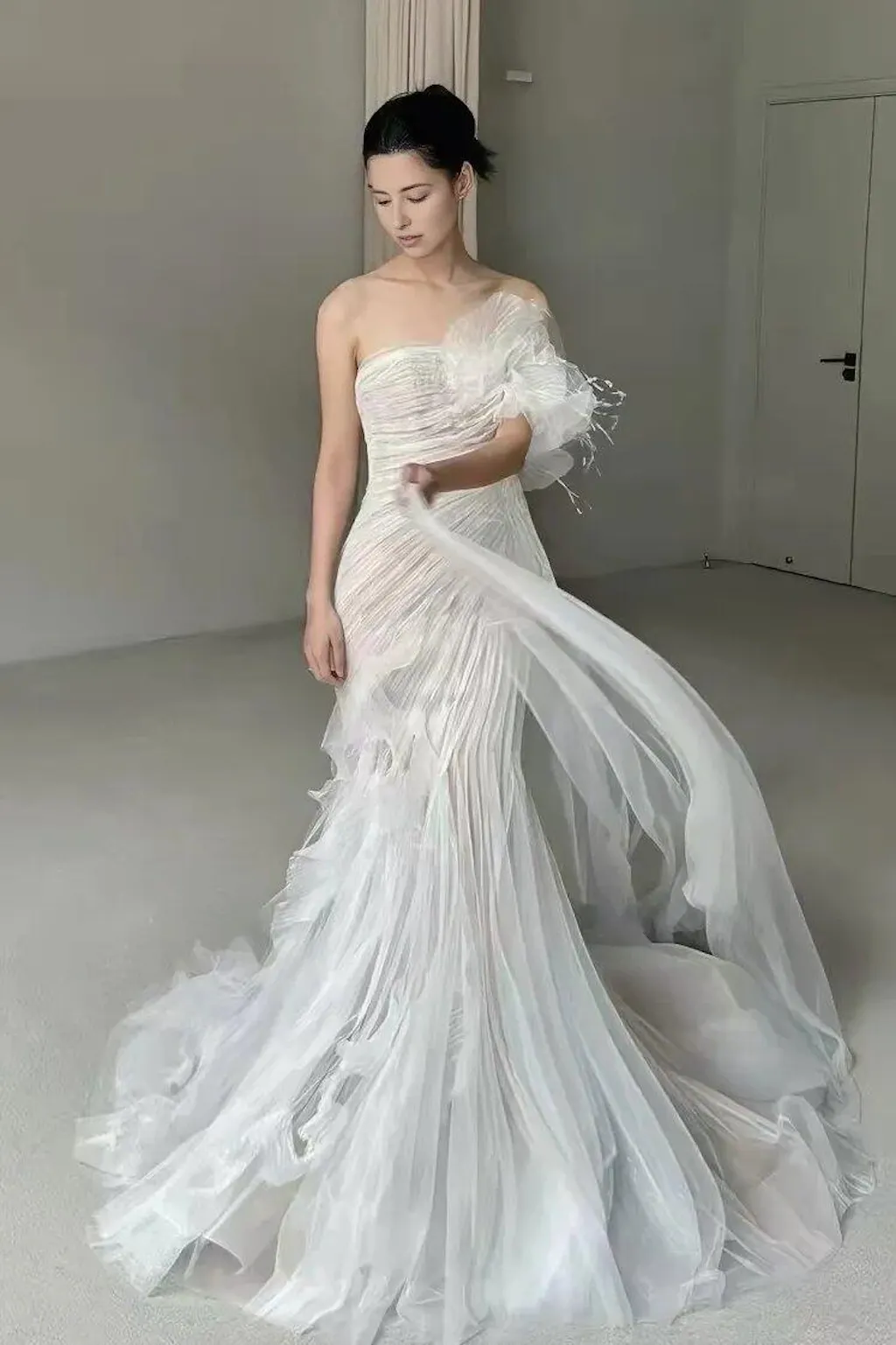 Cette création s'adresse aux mariées qui recherchent une robe avec une véritable âme artistique. Nous avons voulu capturer le mouvement et la légèreté absolue. Pour cela, nous avons orné le corsage et le haut de la jupe de fleurs 3D d'une conception unique : elles sont réalisées dans un tulle légèrement plus rigide pour conserver leur relief sculptural. Mais la véritable magie opère grâce aux délicates plumes naturelles intégrées au cœur des fleurs. À chacun de vos pas, au moindre souffle de vent, les plumes frémissent, donnant à la robe une dynamique et une vie fascinantes.